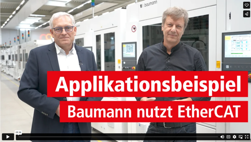 Beckhoff, als Vorreiter in der Steuerungstechnik, wird bei Baumann bereits seit 15 Jahren mit seinen bewährten Technologien und innovativen Ansätzen verwendet, um den steigenden Anforderungen in der Automation gerecht zu werden. In der Live-Schaltung zeigte Stefan Rauch die Vorteile von EtherCAT für Baumann auf, welches eine einfache Einbindung in die weitverbreiteten Anwendungen der Beckhoff-Technologien bietet. Mit dem Ein-Bus-System, der hohen Performance und der Erweiterbarkeit können die Softwarespezialisten von Baumann auf den Kunden zugeschnittene Lösungen anbieten.